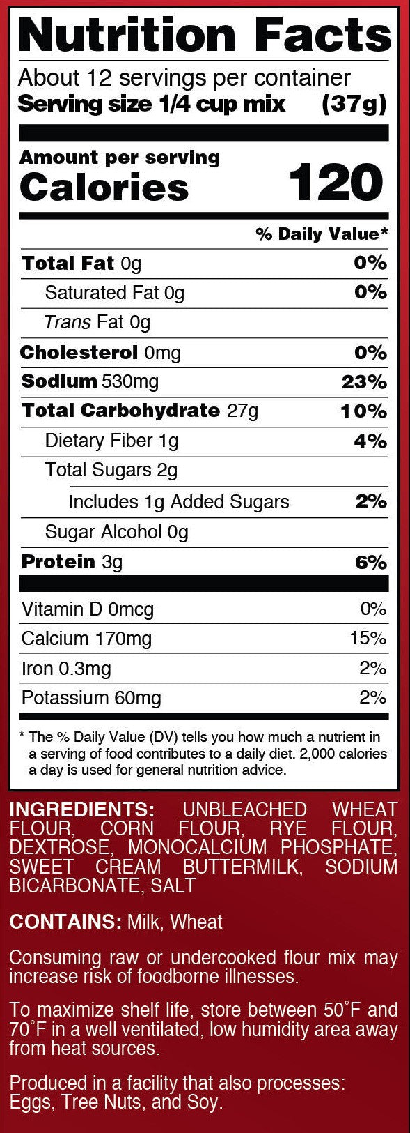 Ingredients: Unbleached Wheat Flour, Corn Flour, Rye Flour, Dextrose, Monocalcium Phosphate, Sweat Cream Buttermilk, Sodium Bicarbonate, Salt